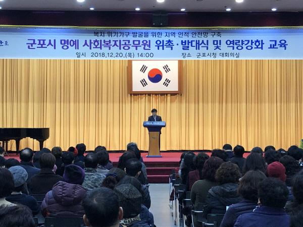 한대희 군포시장은 “무보수·명예직임을 알면서도 명예 사회복지공무원 활동에 자원해준 모든 분이 군포를 더 살기 좋게 바꾸는 복지·행복 지킴이”라며 “이분들의 활약으로 소외 없는 따뜻한 지역사회 만들기가 더 빨리, 성공적으로 달성될 것으로 기대한다”말했다.