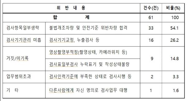 특별점검 결과, 불법 개조차량 및 안전기준 위반차량 합격처리 33건, 검사기기 관리미흡 16건, 영상촬영 부적정 및 검사표 작성 일부 누락 9건 등 61곳 검사소 1곳 당 1건의 불법행위가 있었다.