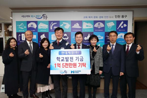 인천 동구는 지난 20일, 접견실에서 박병익 현대제철 인천공장장 및 관내 초·중학교장 등 총 10명이 참석한 가운데 현대제철 학교발전기금 기탁식을 개최했다.
