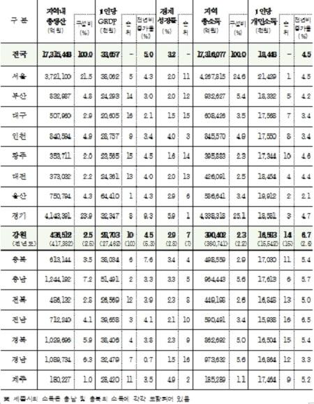 지역총소득은 39조원으로 전년보다 3조원 증가해 지역내총생산 보다 높은 증가율을 보였다. 이에 따라, 지역소득 유출규모는 4조6천억원으로 전년보다 1조1천억원 감소했는데, 도내 기업의 영업이익 확대와 함께 강원상품권 유통에 따른 효과도 일부 반영된 것으로 풀이된다.