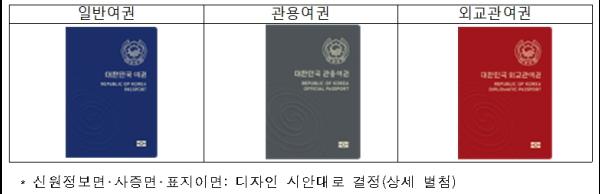 국민의견 조사결과, 일반·관용·외교관 여권을 구분하고 일반 여권의 색상은 남색, 우측 상단에는 나라문장이, 좌측 하단에 태극문양이 양각으로 표현되어 있는 디자인이 채택됐다.