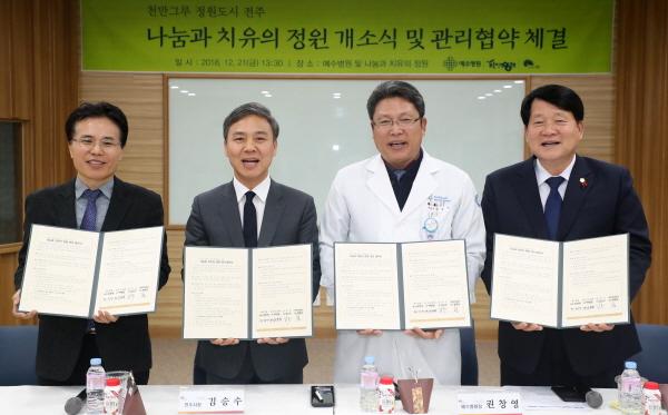 이와 함께, 시와 전주시의회, 푸른전주운동본부, 예수병원은 이날 향후 나눔과 치유의 정원을 지속 가꾸고 관리키로 하는 내용을 골자로 한 협약을 체결하기도 했다.