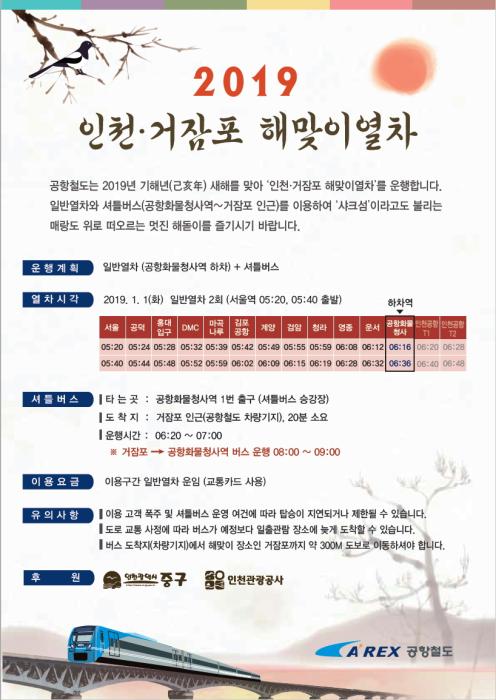 1월 1일 기해년(己亥年)의 첫 태양을 맞이하는 ‘인천 거잠포 해맞이열차’는 서울역에서 2회(05:20, 05:40) 출발한다. 공항철도 공항화물청사역에서 내려서 무료 셔틀버스를 이용하면 해맞이 명소인 ‘거잠포구’ 앞 용유기지까지 편리하게 이동할 수 있다. 행사를 후원하는 인천관광공사는 해맞이 행사 현장에서 선착순 5,000명을 대상으로 핫팩과 포춘쿠키를 제공하는 이벤트를 실시한다. (문의 : www.arex.or.kr, 1599-7788)