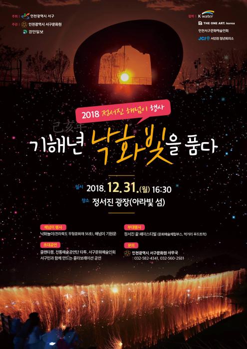 12월 31일 오후 3시 서구 오류동 정서진 아라빛섬 수변무대에서 시민과 함께하는 문화행사로 진행되는 ‘2018 해넘이 행사’는 서구의 예술인·주민 등이 참여하는 콜라보레이션 공연, 시낭송, 전통 불꽃놀이인 낙화놀이 재연, 퓨전 국악그룹 클랜타몽과 전통예술공연단 타투의 무대 공연 등이 이뤄진다. 특히, 올해의 볼거리는 피날레를 장식하는 ‘낙화놀이’다. 타들어가는 낙화봉과 떨어지는 불꽃을 보며 한 해를 정리하고 ‘정서진 노을벽’과 ‘노을종’에서 새로운 희망을 맞이해보자. (문의 : http://www.seogucul.or.kr, 032-582-4341, 032-560-2931)