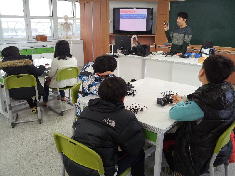 드론의 개념과 원리, 부품 설명 및 조립, 조종법 이해 및 실습, 미니 비행 대회, 드론 항공 영상 촬영 방법 등을 교육받은 학생들은 실제 드론을 만지며 조립도 하고 직접 조종해 보면서 많은 흥미를 갖고 즐거워하였다. 특히 드론으로 촬영된 드라마나 영화 영상을 직접 보면서 실제 우리 생활과 밀접하게 관련되어 있다는 것을 알고 머지않아 택배도 드론으로 배달될 것이라는 선생님의 설명에 놀라워했다.