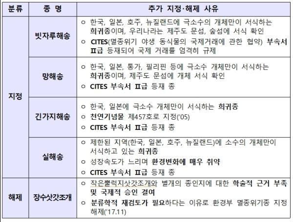 한편, 그동안 보호대상해양생물로 지정되어 있던 ‘장수삿갓조개’는 과거 작은뿔럭지삿갓조개의 아종으로 보고된 바 있으나, 분류학적으로 종에 대한 근거가 부족하여 이번에 지정이 해제됐다. 이에 따라, 국내 보호대상해양생물은 77종에서 80종으로 늘어나게 된다.
