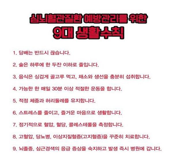 또한, 심뇌혈관질환 예방과 관리를 위해서, 평소 정기적인 혈압, 혈당 및 콜레스테롤 수치 확인과 9대 생활수칙을 준수하는 것이 필요하다.