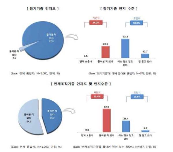 조사 결과 장기기증 인지도는 97.5%로 높았으며, 인체조직기증 인지도는 45.7%로 낮은 상황으로 작년과 유사한 수준이었다.