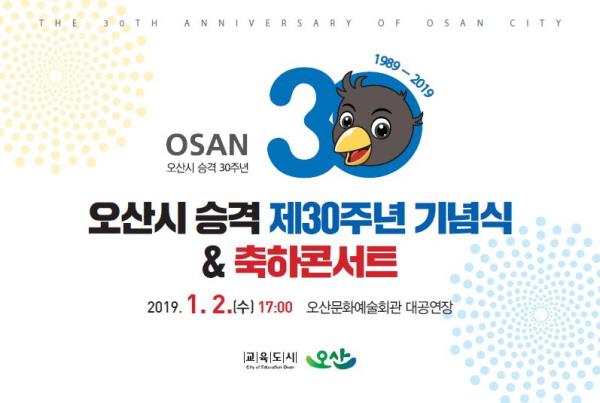 시는 1989년 1월 1일에 오산읍에서 오산시로 승격되어 2019년은 시로 승격한 지 30주년을 맞는 해이다. 시는 뜻깊은 시 승격 30주년을 경축하기 위한 기념식과 축하콘서트를 개최하여 오산시가 전국 최고 수준의 교육도시, 선진 복지 도시로 성장했다을 선포하고 시민들의 자긍심을 높일 수 있는 계기를 마련한다.