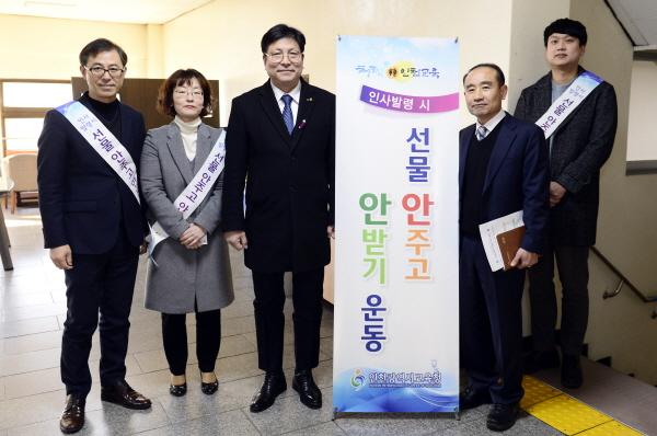인천광역시교육청은 4층 소회의실에서 24일 5급 이상 지방공무원, 26일 6급 이하 지방공무원 및 신규임용자 인사발령에 따른 임용장 수여식에서‘인사발령 시 선물 안주고 안받기’운동 캠페인을 실시했다.