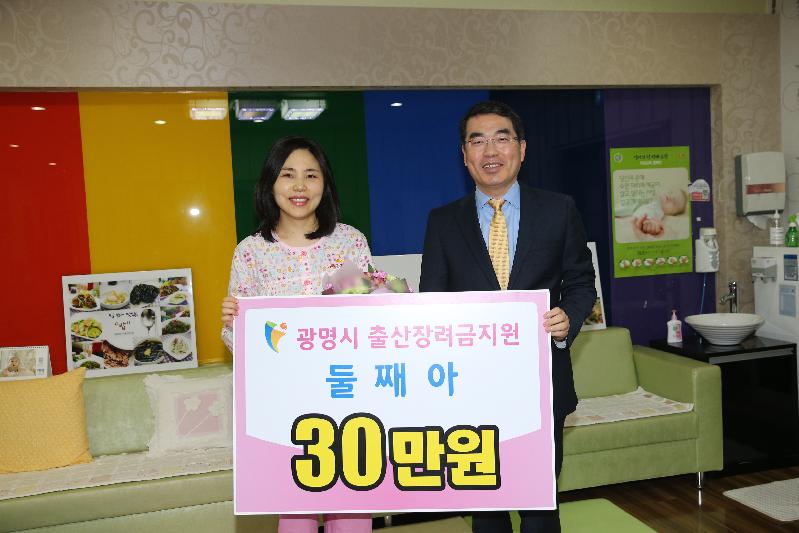 광명시가 올해부터 둘째아를 출산하면 30만원을 지급하는 출산장려금 제도를 확대시행하고 있는 가운데, 양기대 광명시장은 새해 첫날 둘째아를 출산한 하안1동에 거주하는 김희선(여,36)씨에게 광명시 소하1동 소재 산후조리원으로 찾아가 출산장려금 30만원을 첫 번째로 전달했다.