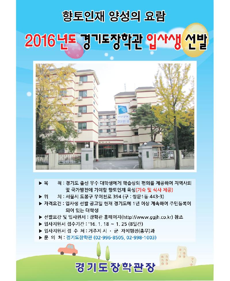 광명시는 대학생들에게 학업에 대한 제반편의를 제공하기 위해 경기도장학관(서울시 도봉구 우이천로394) 및 경기도 송파학사(서울시 송파구 위례순환로364,경기도평생교육진흥원)입사생을 모집한다고 밝혔다.