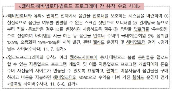 경찰의 분석에 따르면, 웹하드 업체들은 헤비업로더?업로더 프로그래머 등과 결탁하여 수익을 공유하고 음란물을 전문적으로 유통해 온 것으로 나타났다.