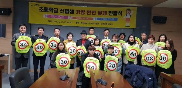 파주시 운정2동 주민자치위원회는 2019년에 입학하는 초등학교신입생들에게 가방안전덮개 1,000개를 나눠주는 ‘2019년 초등학교 신입생 가방 안전 덮개 전달식’을 지난 21일 운정행정복지센터 3층 회의실에서 운정2동장, 운정2파출소장을 비롯한 관내 4개 초교의 각 교장 및 교감, 녹색어머니회, 학생대표까지 참석한 가운데 개최했다.
