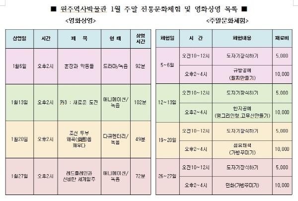 원주시 역사박물관은 주말마다 "전통문화 체험마당"과 "가족영화상영" 행사를 연중 운영하고 있다.
