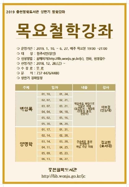 개관 이래 도서관 대표 강좌로 자리매김한 ‘목요철학강좌’는 내년에도 동양철학의 정수를 원주시민들에게 전할 예정이다.