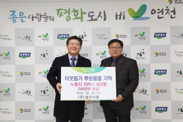 연천군 성찬식품은 지난 26일 연천군을 방문해 사랑의 누룽지 70박스 420봉을 기탁했다.