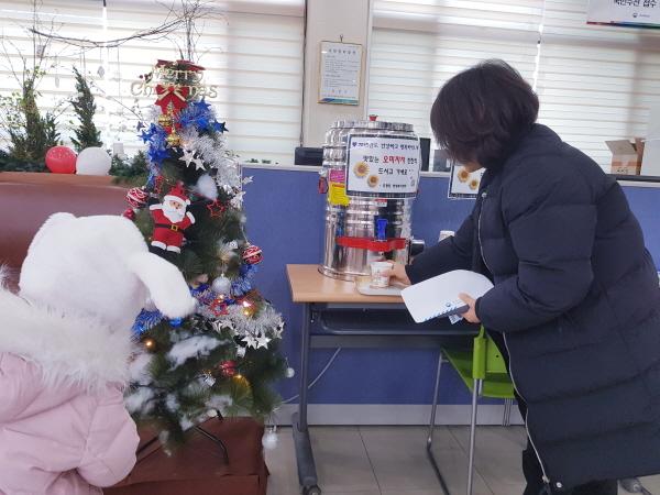 민원접수 및 신청 후 기다리는 동안 예쁘게 꾸민 트리를 구경하며 바쁜 일상을 뒤로하고 잠시나마 여유 있는 웃음을 지을 수 있게 하고 따뜻한 차를 자유롭게 마실 수 있도록 설치하여 민원인의 방문을 기다리고 있다.