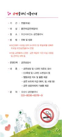 특히 오는 1월부터 신년 금연클리닉 등록자에 한해 휴대폰 보조배터리 지급 이벤트를 진행할 예정으로, 금연을 결심한 흡연자들의 등록을 적극 유도하고자 한다.
