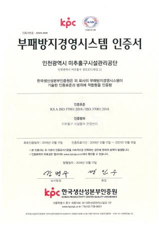 인천 미추홀구시설관리공단이 국제표준 부패방지경영시스템 인증을 획득했다.