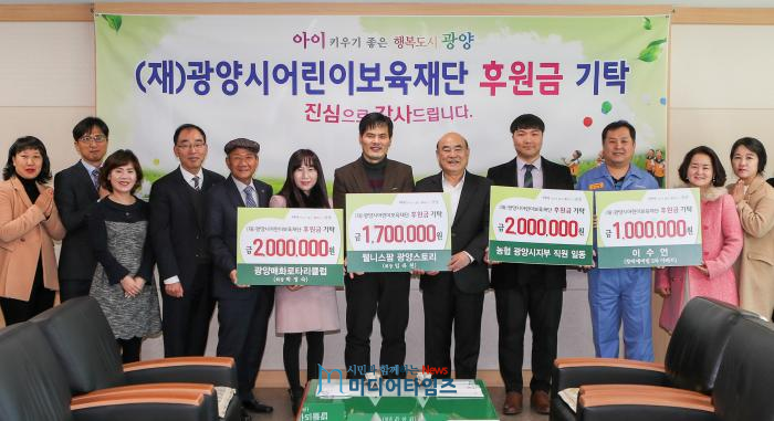 이수언 씨는 “열악한 보육환경 개선에 광양시가 앞장서 어린이보육재단 설립해 주신데 감사드리면서 이번에 전달한 후원금이 보육 사업에 조금이나마 보탬이 됐으면 한다”고 밝혔다.