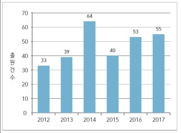 2012년부터 2017년까지 최근 6년간 내국인이 출원한 284건을 출원인별로 살펴보면, 중소기업 148건, 개인 88건, 대학교 및 연구소 37건, 대기업 11건 순으로 나타나 대부분 출원이 중소기업 및 개인을 통해 이루어진 것으로 조사됐다.