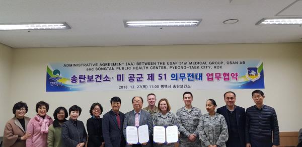 송탄보건소와 미 공군 제 51의무전대가 상호우호 교류 협약을 체결해 신종 감염병 및 해외유입 감염병 발생 시 환자 구호는 물론 이송까지 신속하고 적극적인 공동 대비·대응의 결속력을 다지는 계기가 됐다.