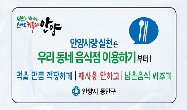이의철 동안구청장은 “많은 시민들이 안양사랑 실천을 동네 음식점 이용으로부터 시작해보시길 바란다”며, “푸짐한 상차림을 선호했던 과거의 잘못된 문화에서 벗어나 적당량을 소비하며 음식 낭비를 최소화할 수 있는 문화가 정착되길 바란다”고 전했다.