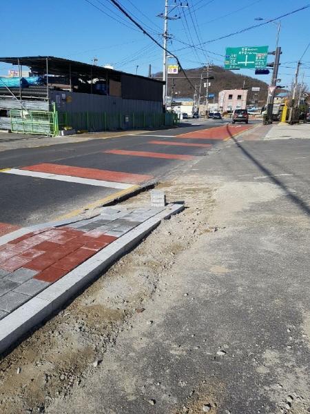 유치원 앞의 도로에는 높은 과속 방지턱이 아닌, 적색 아스팔트를 10여 미터를 교차 시공하여 운전자들의 감속을 유도하고, 좌회전 구간과 정지선을 추가하여 차량이 안전하게 운행할 수 있도록 차선을 조정했다.