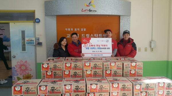 고양시는 지난 27일 일산동구 장항동 소재 ‘오빠네 옛날떡볶이’로부터 드림스타트 저소득 가정을 위한 라면 100박스를 후원받았다.
