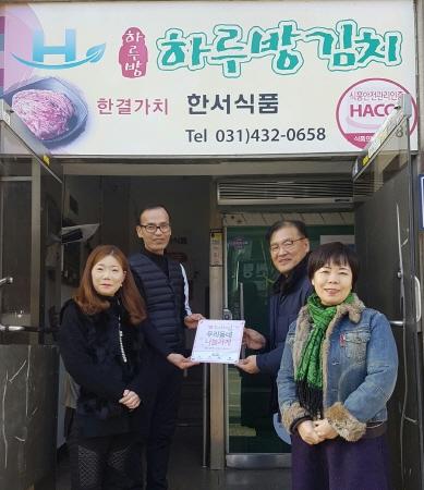 복지시흥디딤돌 수행기관인 정왕종합사회복지관과 정왕본동 행정복지센터에서는 지난 26일 지역사회에서 장기적으로 나눔을 실천하고 있는 기부업체 ‘한서식품’에 ‘우리동네 나눔가게 현판’을 전달했다.