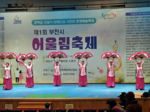 한국지체장애인협회 경기도협회 부천지회는 지난 27일 소사어울마당 소향관에서 ‘제1회 부천시 어울림 축제’를 개최했다. 이날 행사는 300여 명의 시민이 참석한 가운데 저소득장애인자녀 장학금 전달, 자원봉사자 및 후원자 표창장 수여, 국악 공연, 태권도 시범, 부채춤 공연 등으로 3시간 동안 진행됐다.