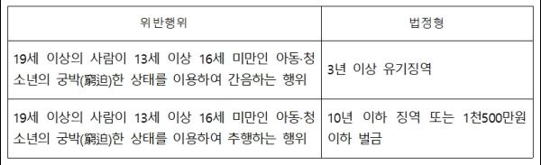 앞으로는 19세 이상 성인이 16세 미만 아동·청소년의 궁박한 상태를 이용하여 간음·추행할 경우 처벌할 수 있고, 신고포상금 지급 대상 범죄에도 포함된다.