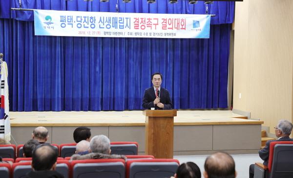 평택항수호 범 경기도민 대책위는 지난 27일 평택항 마린센터에서 경기도 시·군민 회장단 및 지역단체장 등 100여명이 참석한 가운데 평택·당진항 신생매립지 결정촉구 결의대회 및 현장설명회를 개최했다.