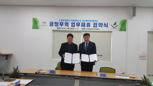 수원로컬푸드지원센터와 ㈜페어트레이드는 28일 수원로컬푸드지원센터 교육장에서 ‘공정무역제품 입점 업무협약’을 체결하고 건강하고 안전한 공정무역 제품 공급을 위해 협력하기로 했다.