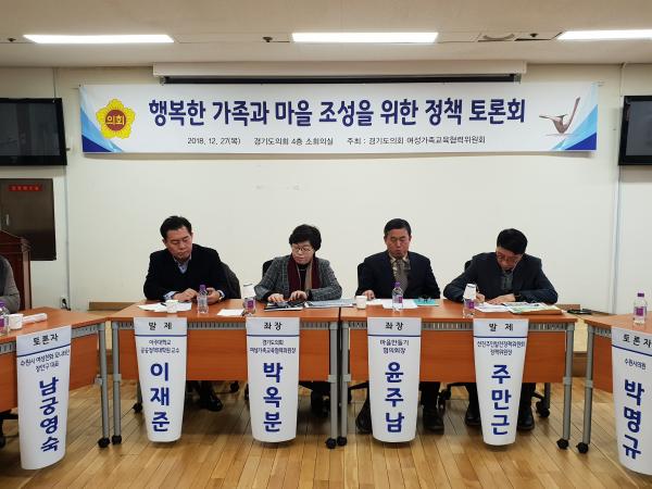 경기도의회 여성가족교육협력위원회 박옥분 위원장 주관으로 27일 경기도의회 회의실에서‘행복한 가족과 마을 조성을 위한 정책 토론회’를 개최했다. 토론회에는 박 위원장을 비롯하여 이재준 아주대학교 공공정책대학원 교수, 주만근 선진주민발전정책위원회 위원장, 윤주남 마을만들기 협의회장 등 30여명이 참석했다.