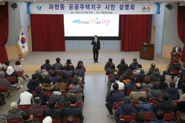 과천시는 과천동 일원 공공주택지구 지정과 관련하여 지난 27일 과천시청 대강당에서 주민설명회를 개최했다고 밝혔다. 설명회에는 김종천 과천시장과 관계 공무원, 시민 300여명이 함께 참석했다.