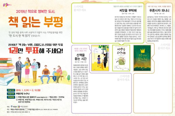 부평구는 오는 2019년 1월 2일부터 2월 10일까지 ‘2019 책 읽는 부평’ 올해의 대표도서 선정을 위한 주민 투표를 한다고 밝혔다.