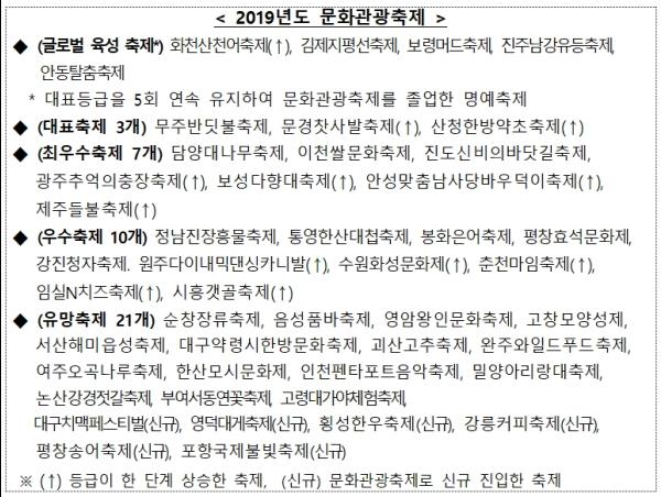 문화체육관광부는 2019년도 대표 문화관광축제 ‘무주반딧불축제’와 ‘문경찻사발축제’, ‘산청한방약초축제’를 비롯해 최우수 축제 7개, 우수 축제 10개, 유망 축제 21개 등 ’19년 문화관광축제 41개를 선정해 발표했다.
