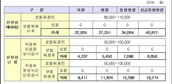 건강보험 보장성 강화대책에 따라 2018년 10월 1일부터 신생아 선천성 대사이상 및 난청 선별검사의 비급여 항목이 건강보험 적용을 받게 됐다.