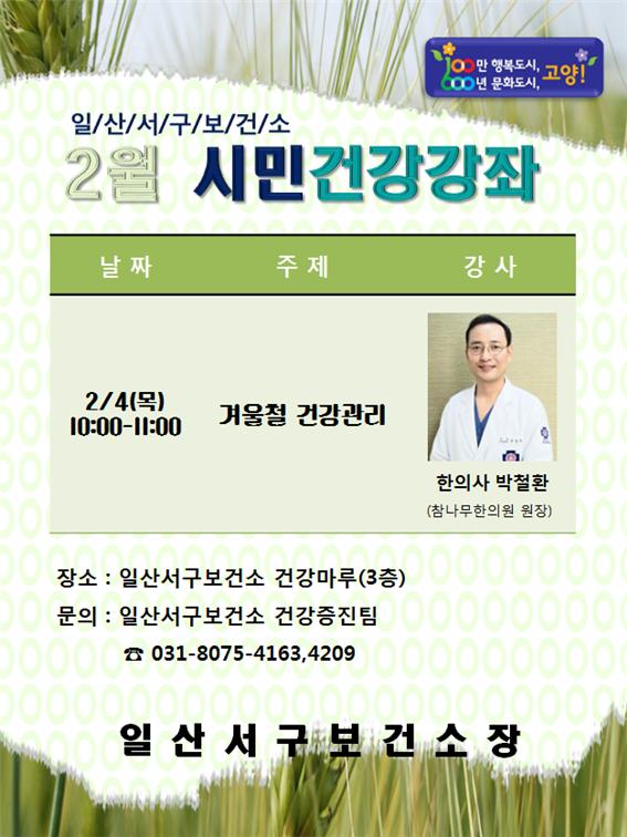 고양시(시장 최성) 일산서구보건소는 지역주민의 건강관리를 위해 오는 2월 4일 오전 10시 일산서구보건소 3층 건강마루에서 ‘겨울철 건강관리’를 주제로 시민건강강좌를 개최한다고 15일 밝혔다.
