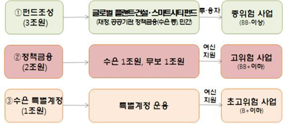 한편, 정부에서도 해외인프라시장 진출 시 금융지원을 위해 글로벌인프라펀드를 확대 조성 할 계획이며, 추가로 6조 원 규모의 금융지원패키지 조성을 추진할 계획라고 밝혔다.