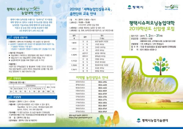 슈퍼오닝농업대학은 평택시에 주민등록을 두고 있는 농업인 및 일반시민이면 누구나 신청할 수 있으며, 2019학년도 모집과정은 생활원예과, 소득작물과, 농산물가공과이고, 2019년 1월 2일부터 31일까지 한 달간 신입생을 모집 중이다.