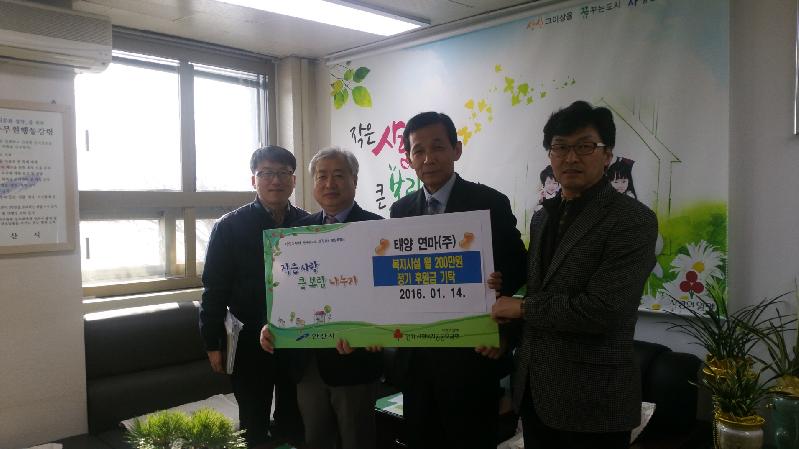 태양연마(주)는 평택지역 사회복지기관에 매년마다 꾸준히 후원 및 봉사 활동을 진행했으며, 지난 해 12월에도 불우이웃을 돕고자 안산시에 2,000만원을 기부했다.