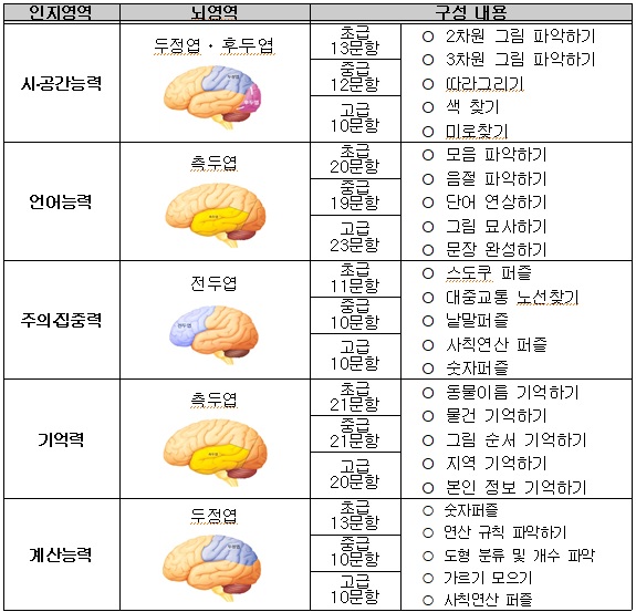 학습지는 인지훈련에 필요한 시공간능력, 언어능력, 주의집중력, 기억력, 계산능력 등 뇌의 전 영역에 걸친 내용을 다루었으며, 난이도별 3단계로 구성되어 맞춤형 학습이 가능하다.