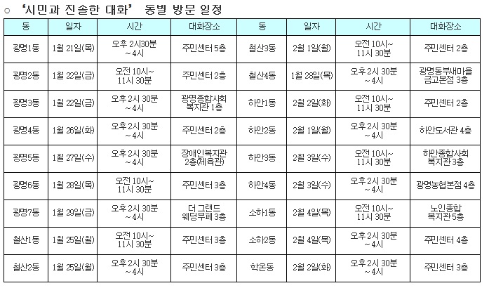 광명시(시장 양기대)는 오는 21일 광명1동을 시작으로 2월 4일까지 18개 동(洞)을 방문, 시정 운영방향을 설명하고 시민들의 다양한 의견을 듣는 ‘시민과 진솔한 대화’를 갖는다.