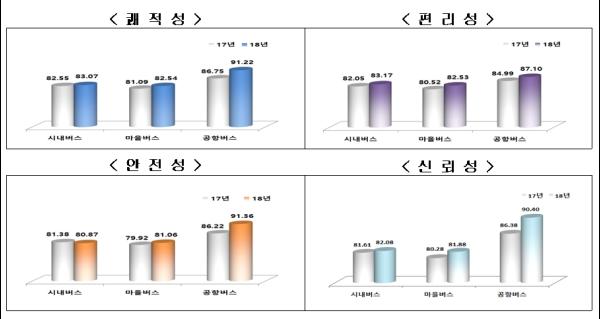 시내버스와 마을버스는 모두 항목별 만족도 중 ‘쾌적성’과 ‘편리성’에서 특히 좋은 평가를 받았다. 시내버스는 쾌적성 83.07점, 편리성 83.17점을 마을버스는 쾌적성 82.07점, 편리성 82.04점을 받았다.