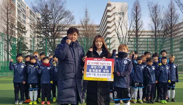 장슬기 선수는 인천지역사회 축구 꿈나무인 남동구 유소년축구단 어린이들과 지난 31일 구월근린공원에서 만나 그동안 기술 및 경험을 전수하는 재능기부와 동계 야외 체육활동에 보탬이 되기 위한 물품을 후원했다.