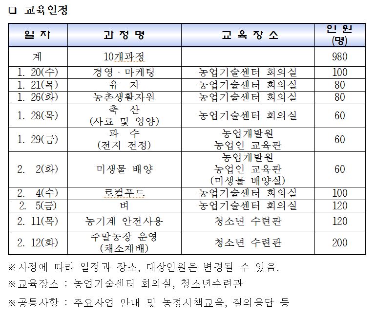 한편 이번교육을 받고자 하는 농업인은 아래의 교육일정를 참고하여 적극 참석해 줄 것을 당부했다.