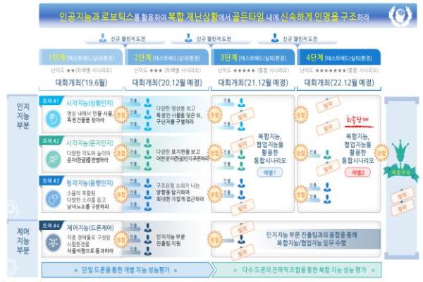 이번에 개최되는 ‘2019년 인공지능 R&D 그랜드 챌린지’ 주제는 "인공지능과 로보틱스를 활용하여 복합 재난상황에서 골든타임 내에 신속하게 인명을 구조하라"로서, 최종목표를 달성하기 위해 2019년부터 2022년까지 4개년에 걸쳐 총 4단계로 진행될 예정이다.